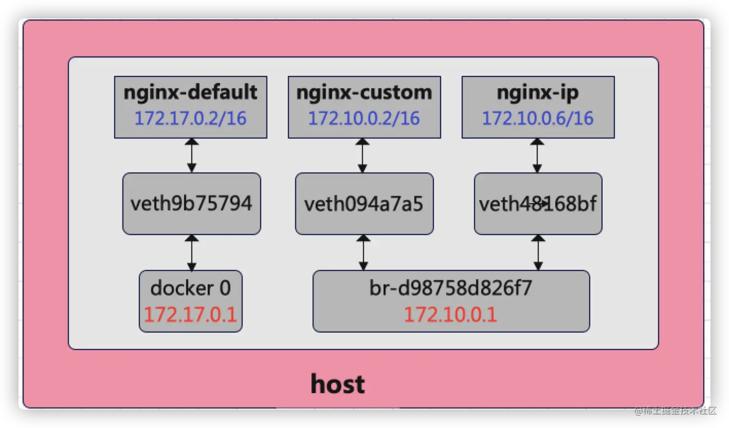 两个容器要能通信,就必须要有属于同一个网络的网卡,当满足这一条件后,容器就可以通过 ip 进行交互了