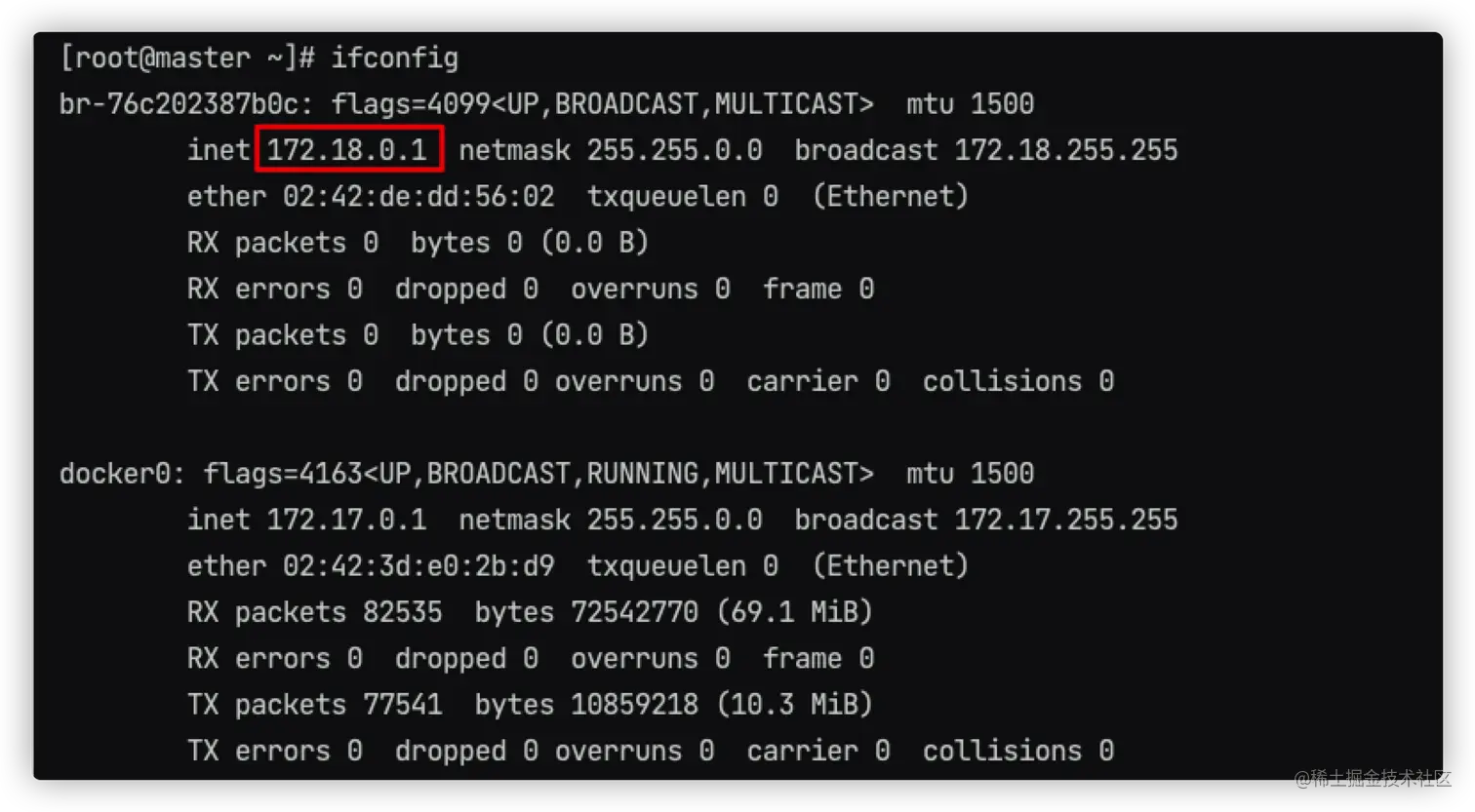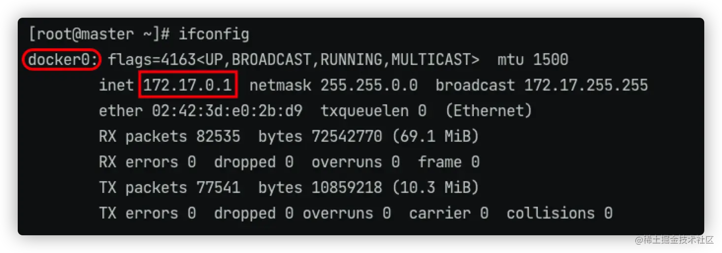 发现有个bridge网络配置的subnet就是172.17.0.0/16,并且网关是172.17.0.1。那么这个网关就是 docker 0!小菜农在宿主机输入 ifconfig' 进行验证