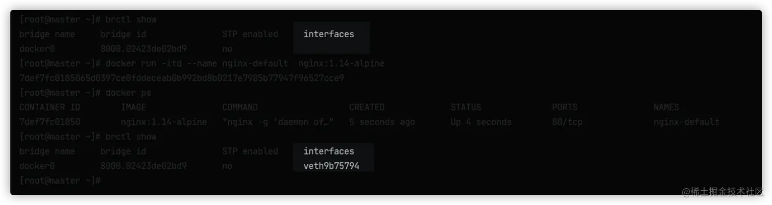 他通过brctl show查看宿主机的网桥配置,发现有个命为 docker0 的网桥,然后他通过启动一个容器继续观察网桥变化: