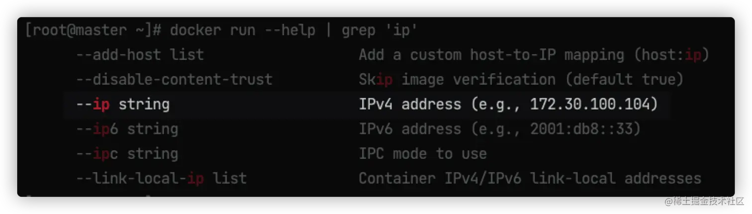 可以看到使用自己配置网络启动的容器,分配到的 IP 地址是 172.10.0.2/16,“既然容器的 IP 都是docker 自动从 subnet中分配的,那我能不能指定一个静态IP呢?”小菜农又提出了疑问,那么只能再祭出老套路 --help 进行解决了!小菜农手脚麻利的敲下 docker run --help | grep 'ip' 查看结果
