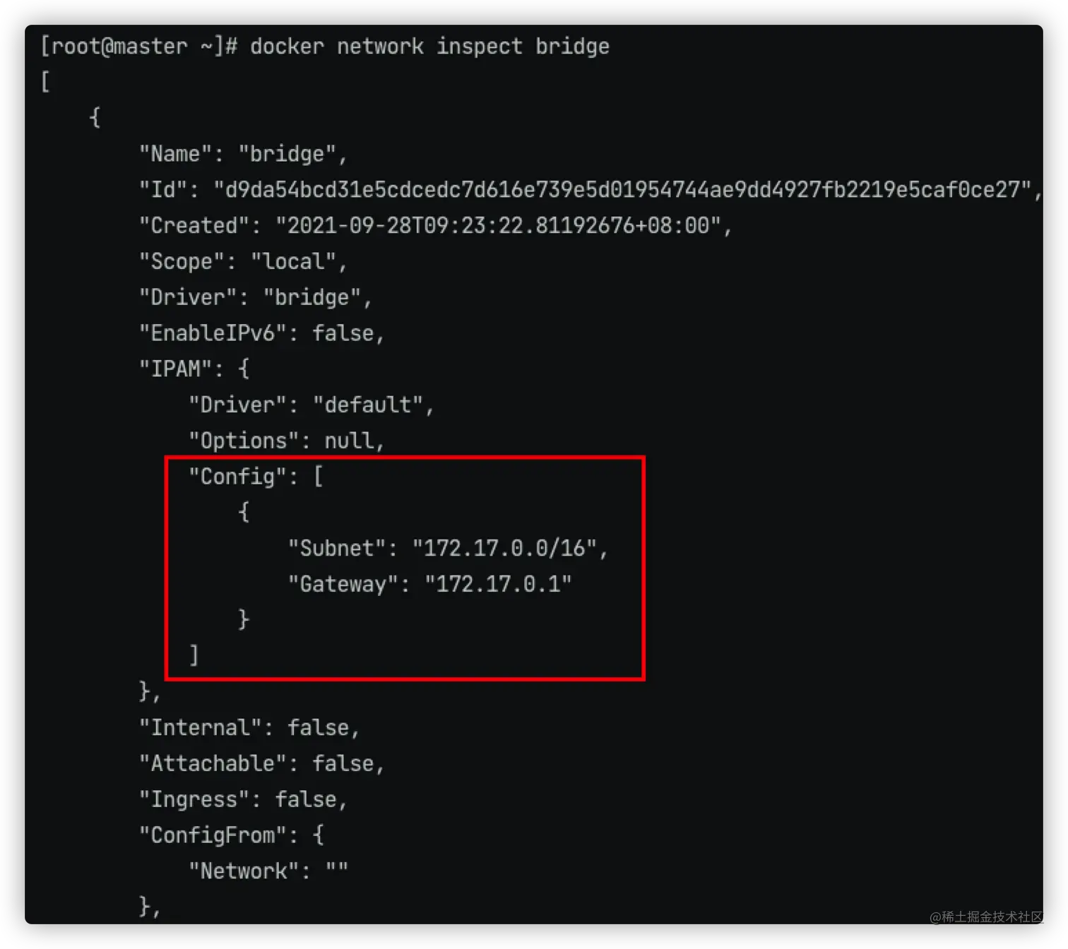 而 172.17.0.2/16 这个 IP 也就是宿主机配置的,小菜农查看了下docker 的bridge配置
