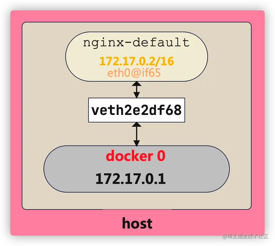 “嘿嘿,被我发现了吧,要不是我会点网络,还真被这忽悠住了。刚刚上面查看到的网络接口是 veth9b75794,而这里是 eth0@if67,换成刚接粗网络的童鞋肯定一头雾水,这两个怎么不一样!实际上 eth0@if67 和 veth9b75794 是一对 veth pair,veth pair 是一种成对出现的特殊网络配置,而这就是我上面猜测的那样,网桥就是可以把它们想象成由一根虚拟网线连接起来的一对网卡,网卡的一头(eth0@if67)在容器中,另一头(veth9b75794)挂在网桥docker0上,其效果就是将eth0@if67也挂在了docker0上”