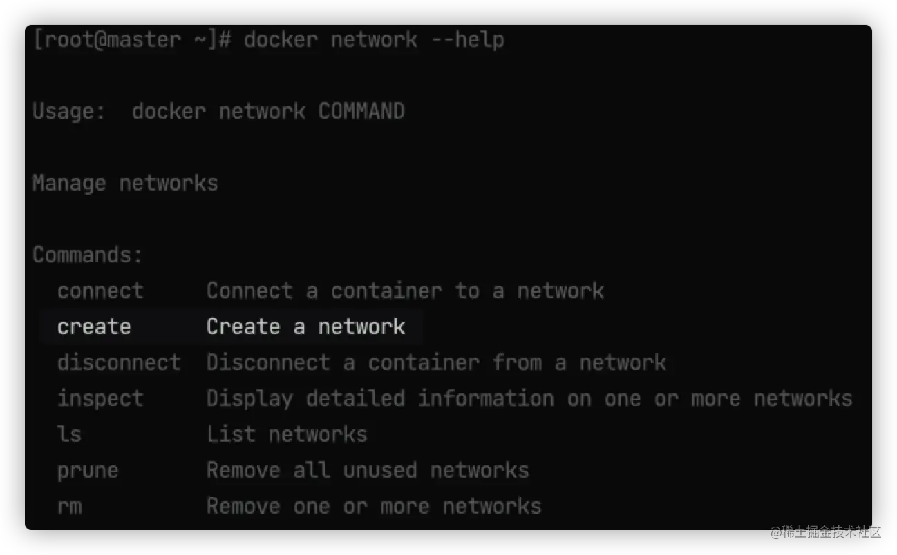 到这里,小菜农已经熟悉了 docker 的三种网络类型的情况,便开始思考如何可以自定义网络,肯定存在很多场景用户需要根据业务来创建自定义网络来满足需求。在上面小菜农想要查询docker的网络配置时有输入过命令 docker network --help,输出结果的时候小菜农有点印象其中好像有个 create 的命令,赶紧又输入一遍进行确认: