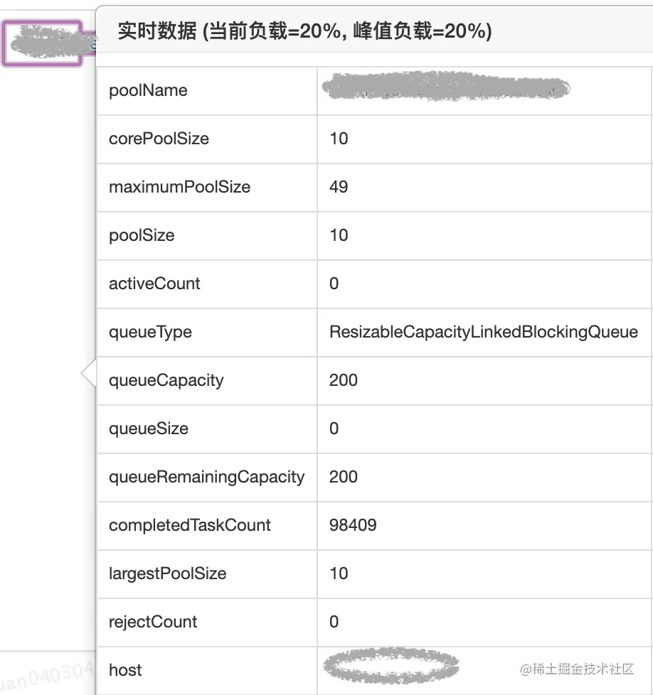 动态化线程池基于这几个接口封装了运行时状态实时查看的功能,用户基于这个功能可以了解线程池的实时状态,比如当前有多少个工作线程,执行了多少个任务,队列中等待的任务数等等。效果如下图所示: