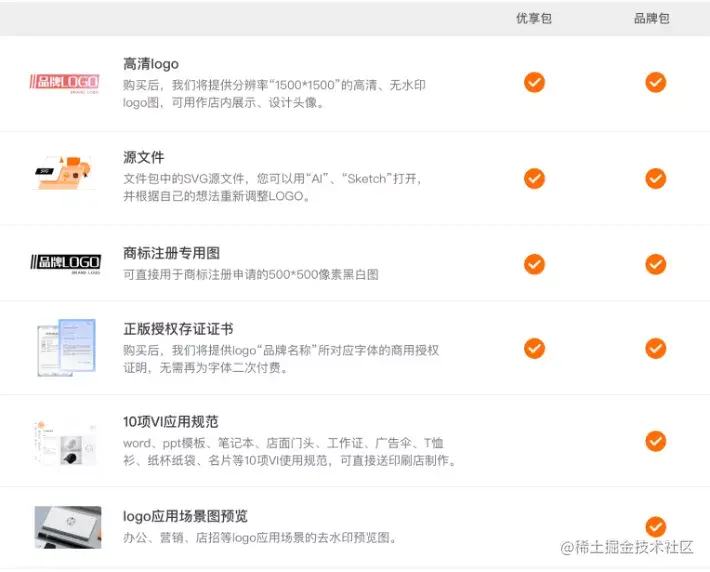 如果选择“品牌包”,除了基础服务外,还有10项VI应用规范和logo应用场景图预览,可以用来传播、做品牌的Office模板,还有文具周边、文化衫等等,满足大部分场景的需要了。