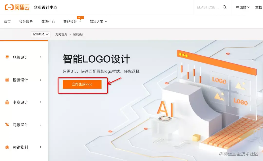 登录阿里云企业设计中心首页,点击“立即生成logo”,就能免费体验logo生成的环节。