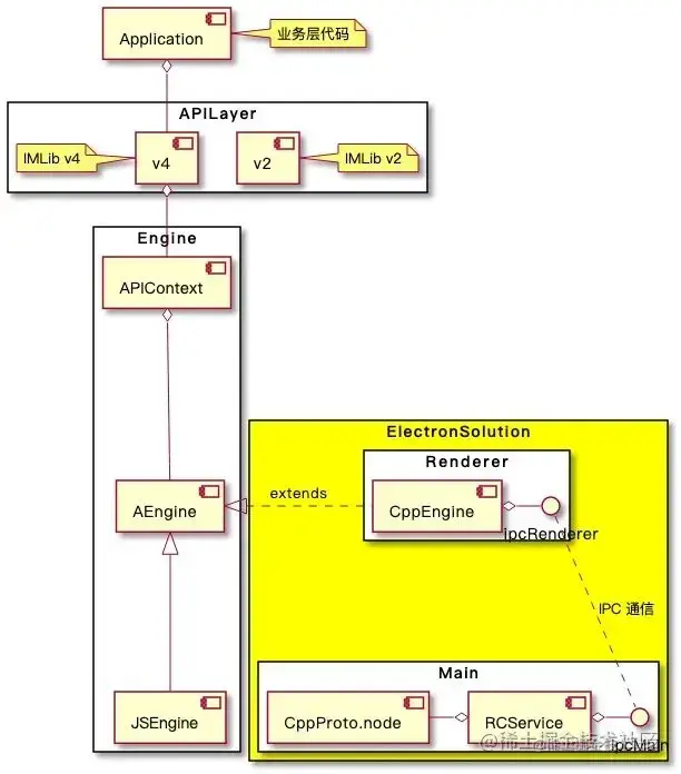 做分层的另一个考虑还为了达成目标 2,将与业务层的交互限制在 API 层,在 Engine 中处理 Electron 与 Browser 两种运行时下的代码差异,业务层只需关心 IM SDK 的接口调用而无需关心底层差异,确保业务层在两种运行时下只需要维护极少甚至无需维护兼容代码,便于业务层更专注于业务开发。