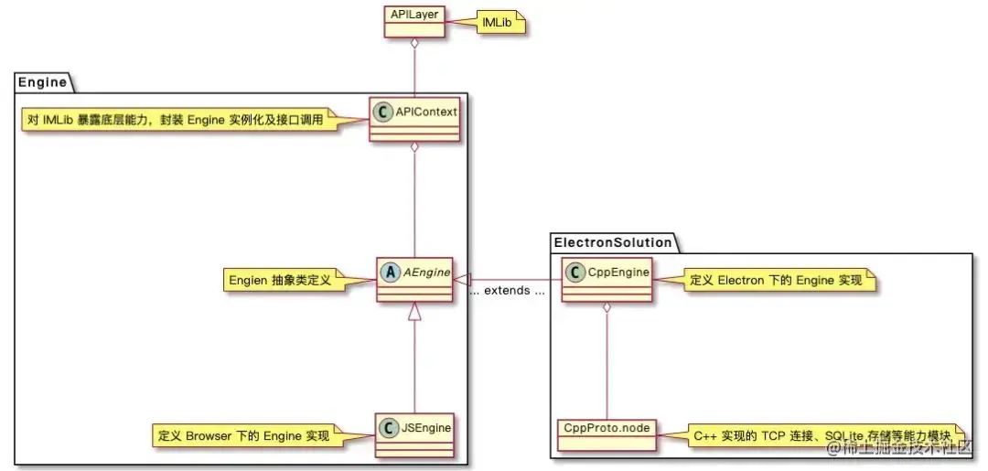 在 Browser 与 Electron 平台下,从连接管理、到消息收发等实现方式迥异,团队需要对 Engine 包继续分层,通过 AEngine 抽象类来定义 IM Engine 的能力接口,并抽象 APIContext 类用来管理 AEngine 的能力调用。