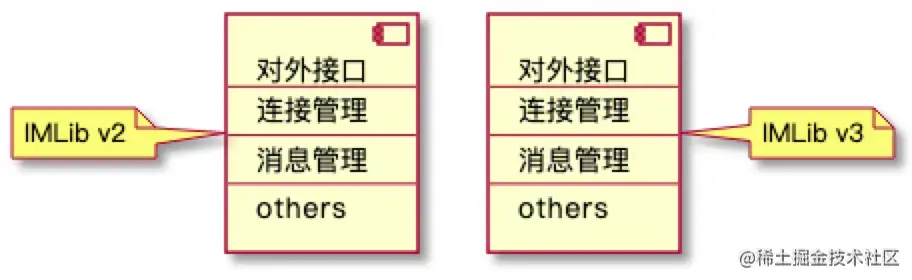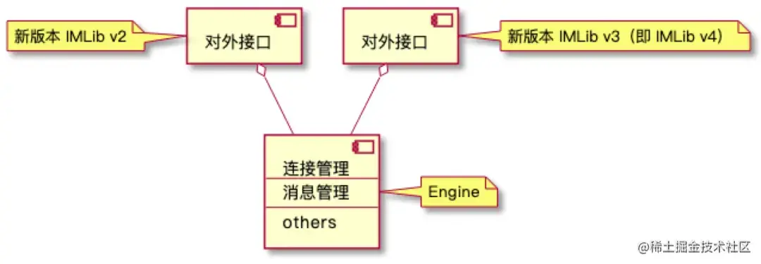 为更好地达成目标 4,团队决定优先通过重构将既有业务分层,各个版本所必须的业务代码抽象下沉为 IM Engine 包,并为各个版本 IM SDK 分别实现不同的 APILayer 以便与既有线上版本接口对齐,这样既可以降低团队的研发成本,也可以满足既有线上客户后续的升级需求。