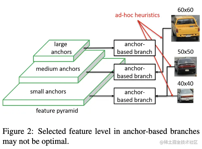 如图2所示,60x60选择中间的anchor,而50x50以及40x40的则选择最小的anchor,anchor的选择都是人们根据经验制定的规则,这在某些场景下可能不是最优的选择。