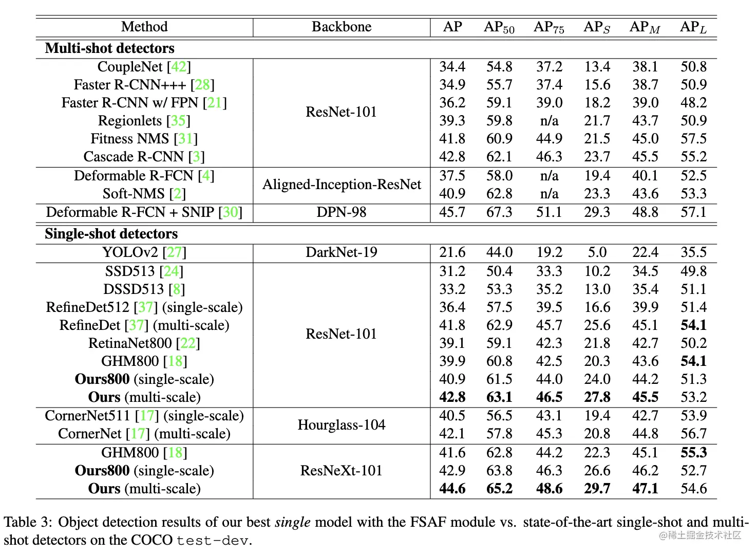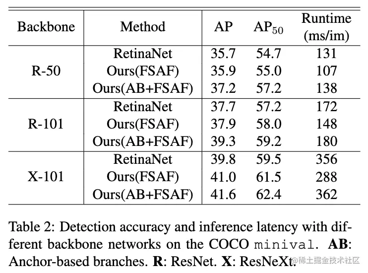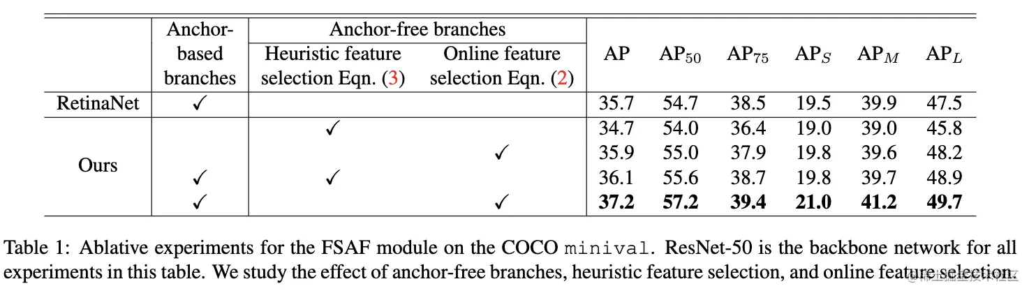 由于FSAF对原网络的改动很少,在推理时,稍微过滤下anchor-free和anchor-based分支的结果,然后合并进行NMS。