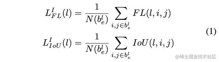 anchor-free的设计允许我们使用任意的FPN层进行训练,为了找到最优的FPN层,FSAF模块需要计算FPN每层对目标的预测效果。对于分类与回归,分别计算各层有效区域的focal loss损失以及IoU loss损失: