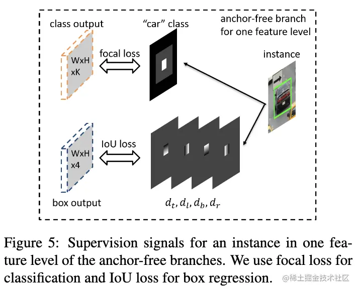 回归结果输出为分类无关的4个偏移值维度,仅回归有效区域内的点。对于有效区域位置,将映射目标表示为,分别为当前位置到的边界的距离,对应的该位置上的4维向量为,为归一化常量。回归的训练采用IoU损失,完整的anchor-free分支的损失取所有有效区域的损失值的均值。