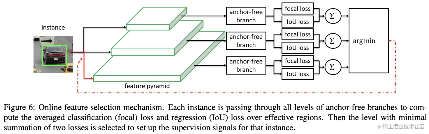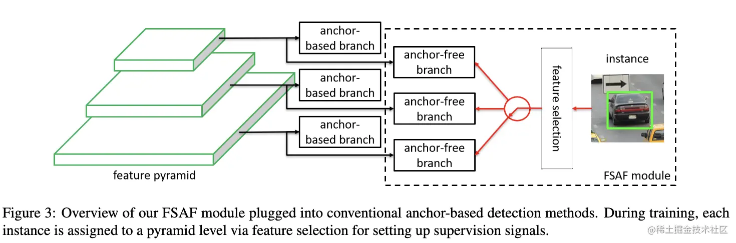 为了解决上述的问题,论文提出了简单且高效的特征选择方法FSAF(feature selective anchor-free),能够在每轮训练中选择最优的层进行优化。如图3所示,FSAF为FPN每层添加anchor-free分支,包含分类与回归,在训练时,根据anchor-free分支的预测结果选择最合适的FPN层用于训练,最终的网络输出可同时综合FSAF的anchor-free分支结果以及原网络的预测结果。