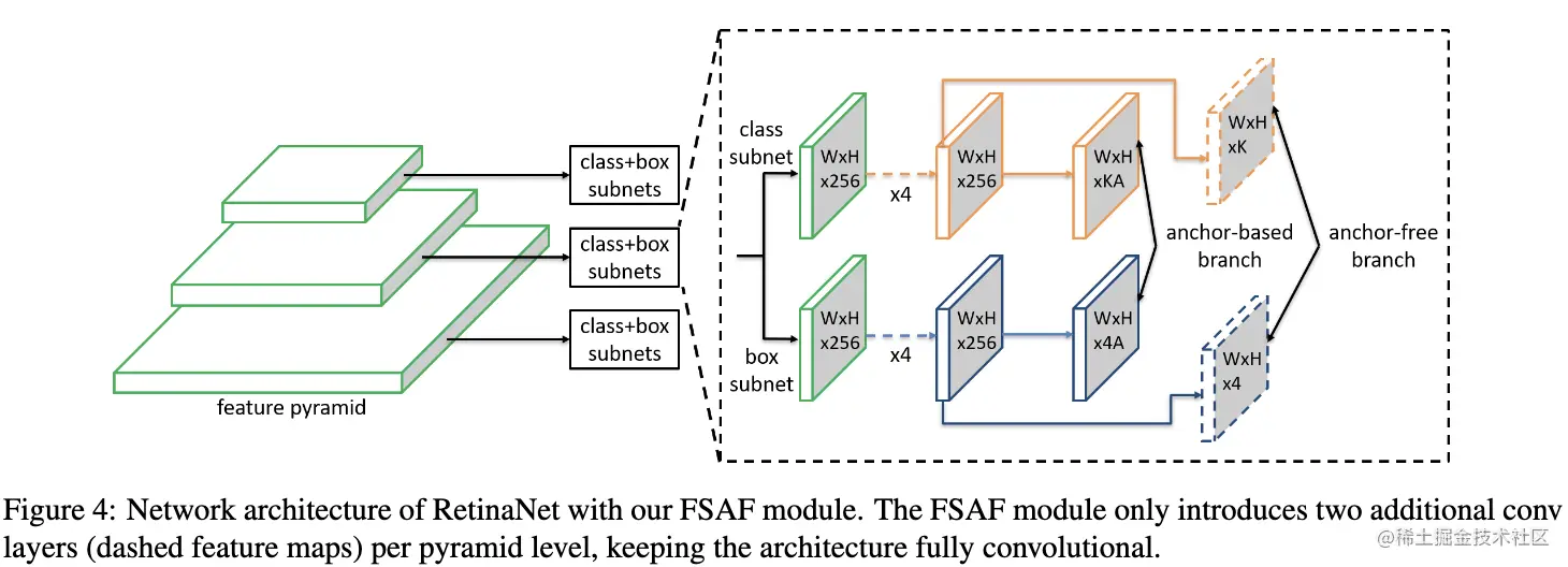 FSAF的网络结果非常简单,如图4所示。在原有的网络结构上,FSAF为FPN每层引入两个额外的卷积层,分别用于预测anchor-free的分类以及回归结果。这样,在共用特征的情况下,anchor-free和anchor-based的方法可进行联合预测。