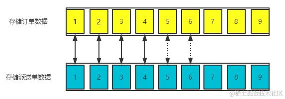 但是对于上诉需求,肯定是需要两个队列的,一个存储订单数据一个存储派送单数据,两个队列应该存在对应关系,如图所示