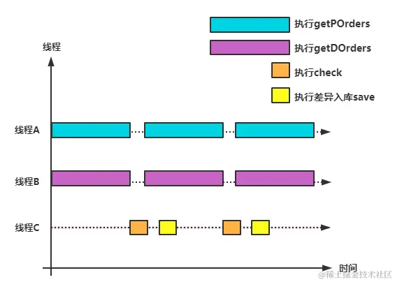 到这里性能的初步优化就已经完成,还能进一步优化性能吗?当然可以目前优化的只是查询订单和查询派送单逻辑并行,两个查询和对账逻辑,差异数据入库还是串行的,如果在执行对账逻辑的时候,就可以执行下一轮的查询逻辑,那性能是不是更好呢?过程如下图所示