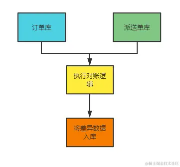 假设存在业务场景,电商系统有一个对账系统,该对账系统就是先查询订单库再查询派送单库,然后执行对账逻辑,将它们的差异写入差异库,逻辑如下所示。