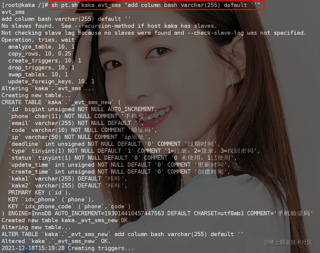 来试试直接在根目录执行给evt_sms表添加一个bash字段,看到下图就知道我们的配置成功了