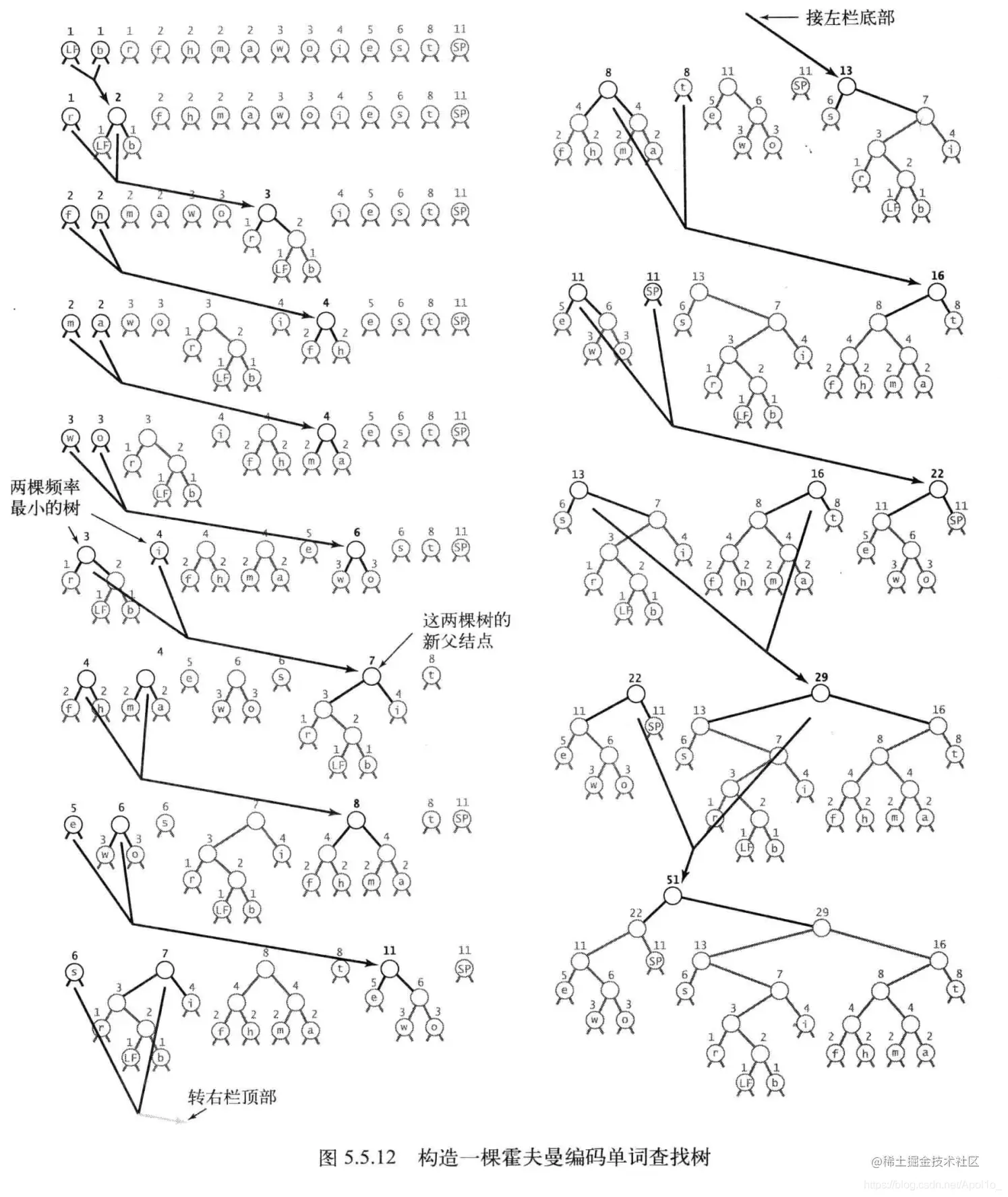 - 首先找到两个频率最小的节点,创建一个以两者作为子节点的新节点(新节点的频率 = 两子节点之和)