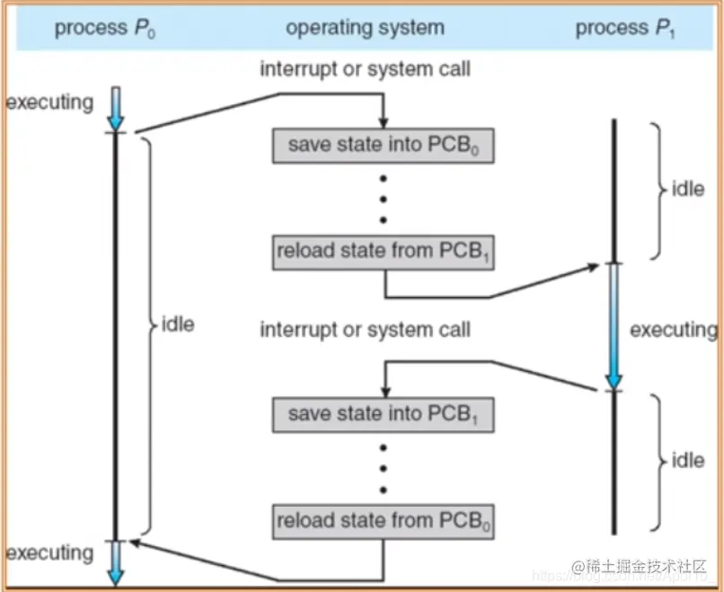 当进程与进程间因中断(interrupt)或系统调用(system call)时会发生上下文切换