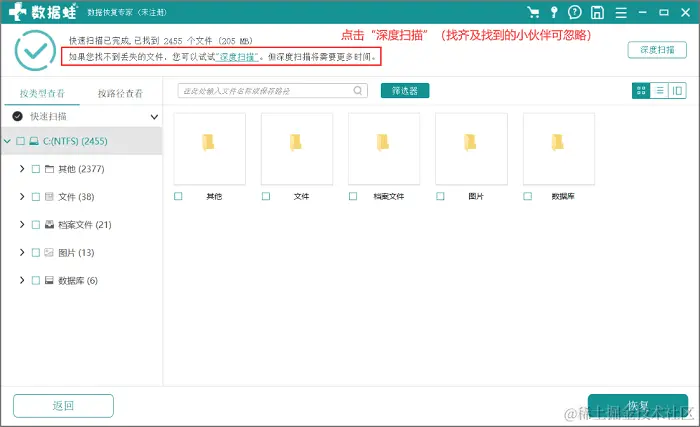 备注步骤:很多人发现第一次扫描比较快,但是虽然找到了部分文件却并不算很全面,这种时候我们点击“深度扫描”(无特殊情况可跳过该步骤)就OK了!