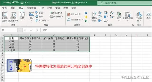 步骤1.选中需要插入图表的单元格,需要含有数据的单元格哦!否则转换成图表后会是一个“花瓶”。