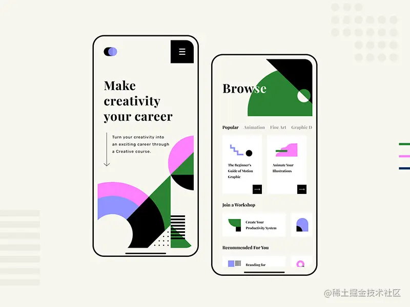 为什么呢?抽象图像和几何艺术在移动应用程序中看起来非常艺术。它吸引了对颜色和形状的关注,而不会分散应用程序的功能和创建原创设计的注意力。根本不需要求助于昂贵的摄影和真实照片或插图。这是牢牢抓住用户注意力的最简单方法。