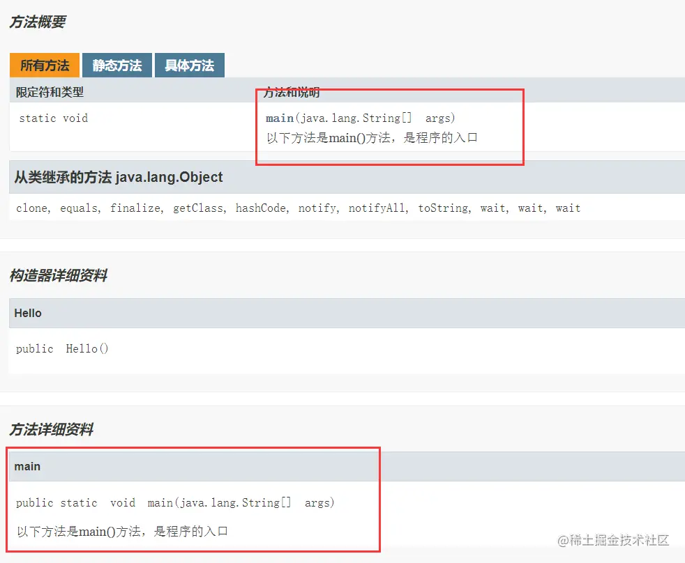 描述部分的第一行应该是一句对类、接口、方法等的简单描述,这句话最后会被 javadoc 工具提取并放在索引目录中。