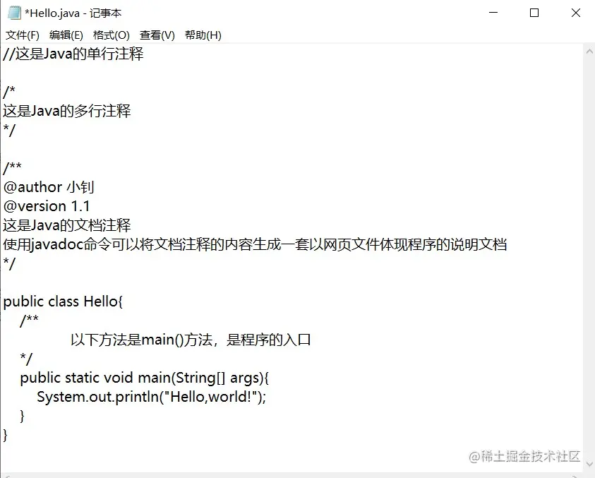 Java的三种注释: * 单行注释 * 多行注释 * 文档注释 Java文档注释: 使用 /* */ 将文档注释内容括起来。