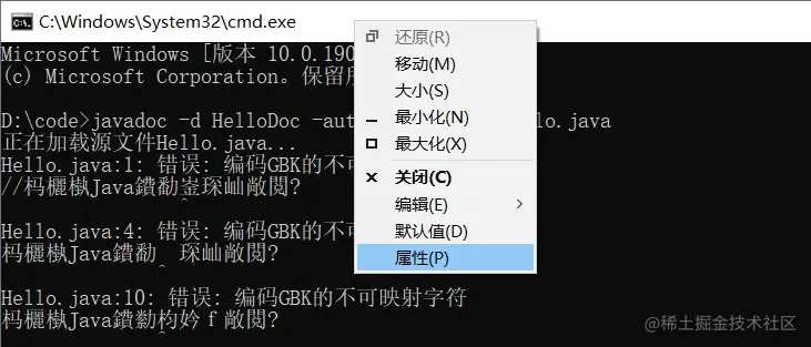 是因为命令行窗口当前的编码为GBK,而文档注释里存在中文,GBK编码不支持中文,从而导致乱码。 (右键窗口白色部分点击属性查看命令行窗口编码)