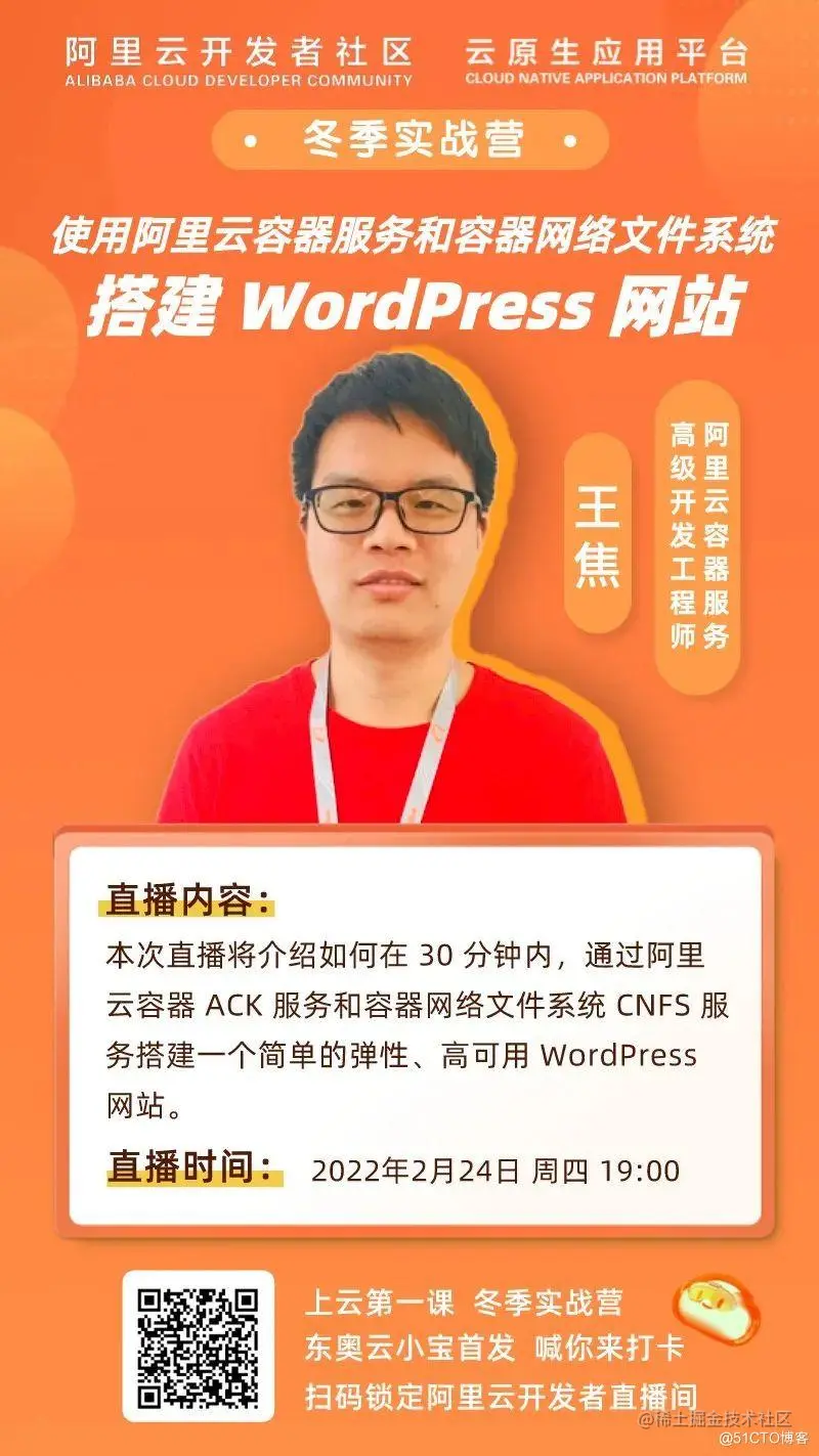 本场直播将介绍如何在 30 分钟内,通过阿里云容器 ACK 服务和容器网络文件系统 CNFS 服务搭建一个简单的弹性、高可用 WordPress 网站。