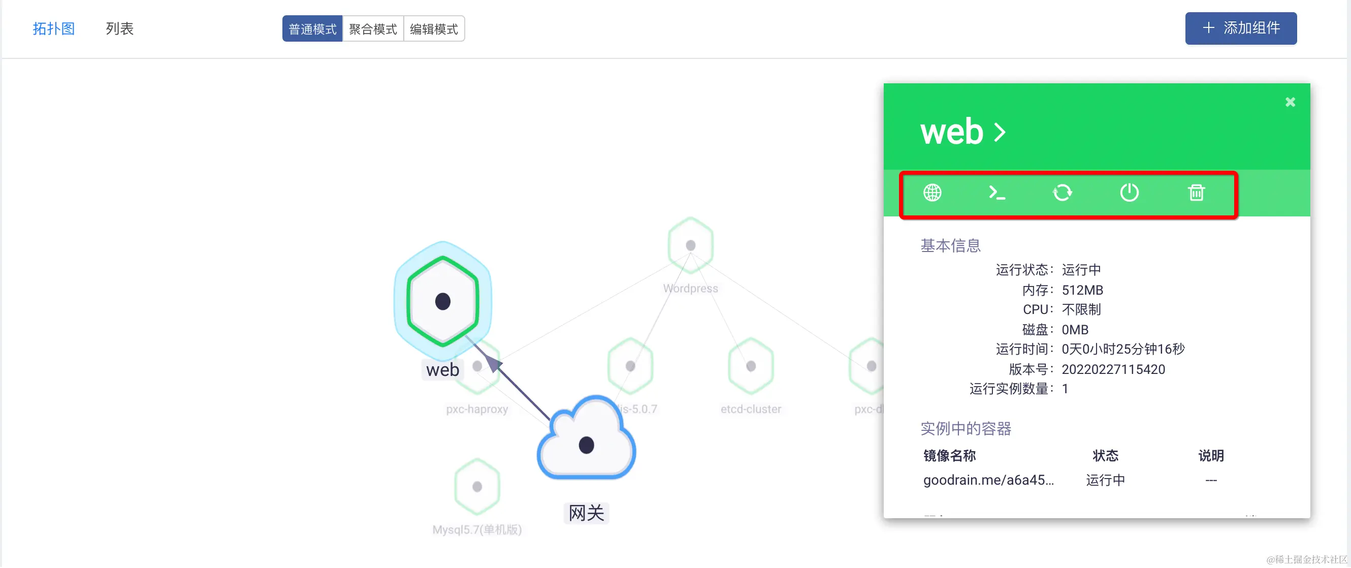 在新版本中,拓扑图展示信息处给出了一排组件操作按钮,分别是访问组件、进入Web终端、更新组件、关闭组件、删除组件。用户可以根据这些按钮快速操作组件,同时下方展示出了组件内的容器信息。极大的提升了用户的操作效率。