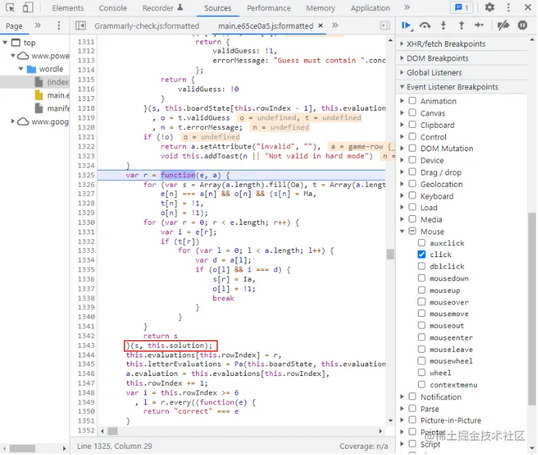 然后我们可以在调试器中为鼠标点击添加一个事件监听器,看看当我们点击虚拟键盘上的ENTER时,哪一行代码被触发(这将触发答案检查)。