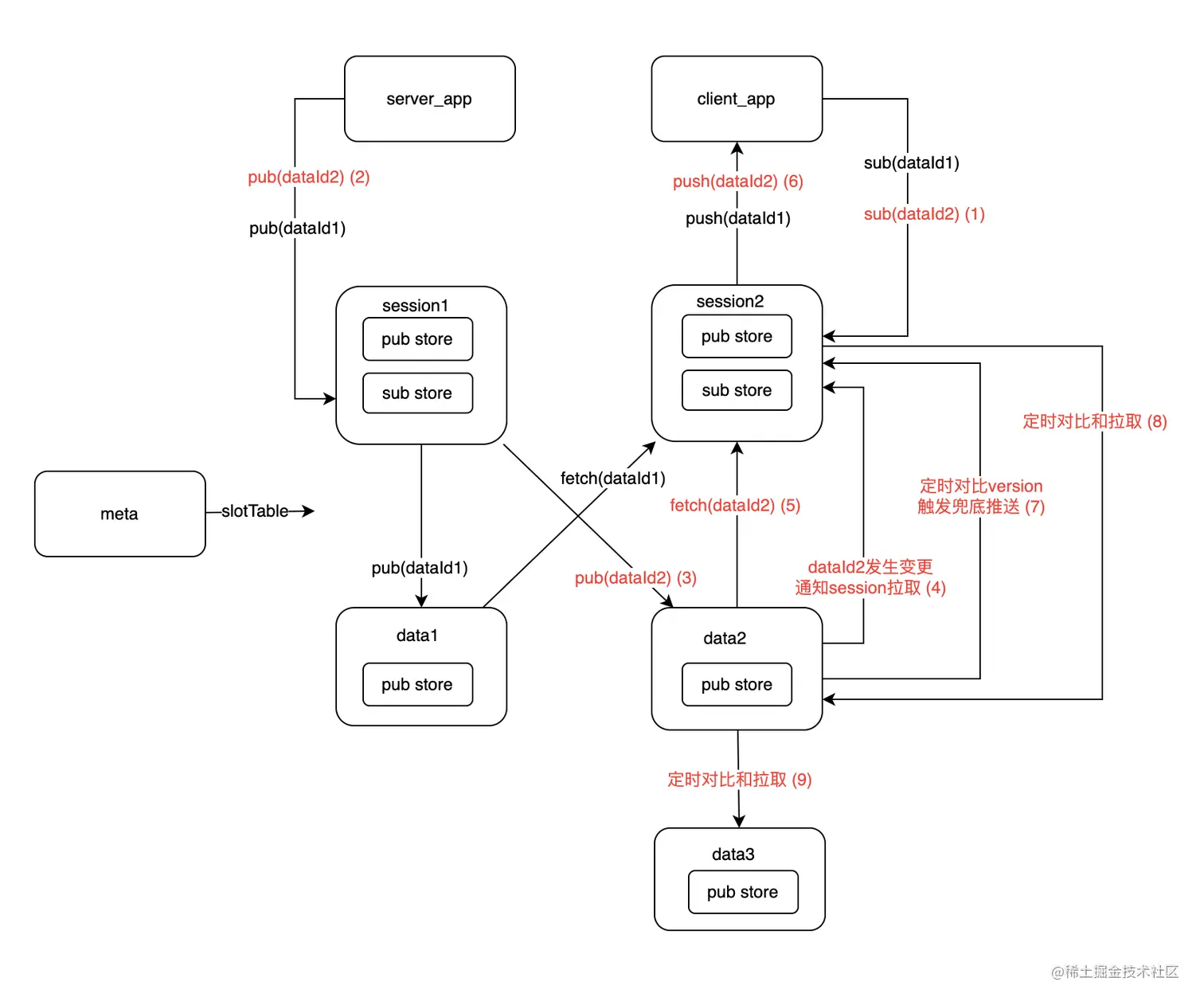 Session 在进行路由的时候,根据 DataInfoId 的 Hash 值确定数据所在 Slot,再从路由表中拿到数据对应的 Data 节点进行数据拉取,每个 Slot 都会有一个主节点和多个副本节点,从而实现主节点宕机的时候,副本节点能快速提升为主节点。