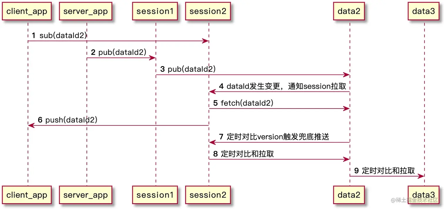 当 data 内发生服务变更(比如接受到了新的 pub),data 会通知所有的 session 触发对应 dataId 推送