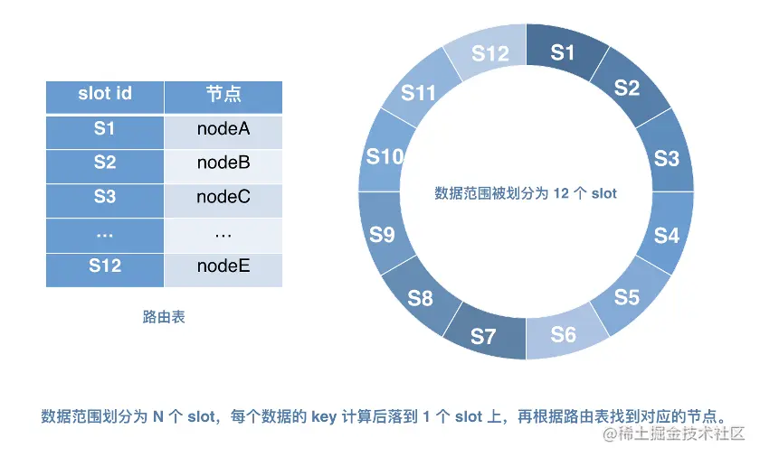 我们从逻辑上将数据范围划分成 N 个大小相等的 Slot,并且 Slot 数量后续不可再修改。然后,还需要引进“路由表”SlotTable 的概念,SlotTable 负责存放这每个节点和 N 个 Slot 的映射关系,并保证尽量把所有 Slot 均匀地分配给每个节点。