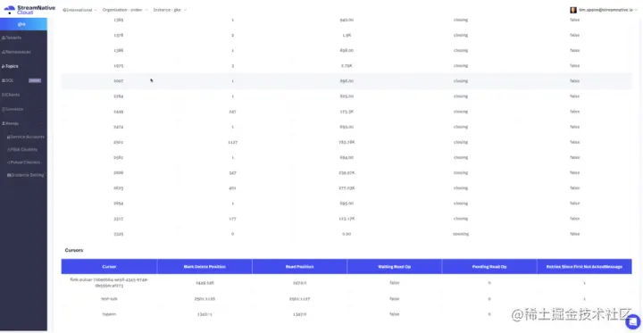 现在,我们有了源源不断的事件流进入我们的 Pulsar 集群,我们可以验证数据并监控进展。以 StreamNative Cloud Manager 界面为例,如下图所示。我们还可以选择查看此处记录的 Pulsar 指标端点。