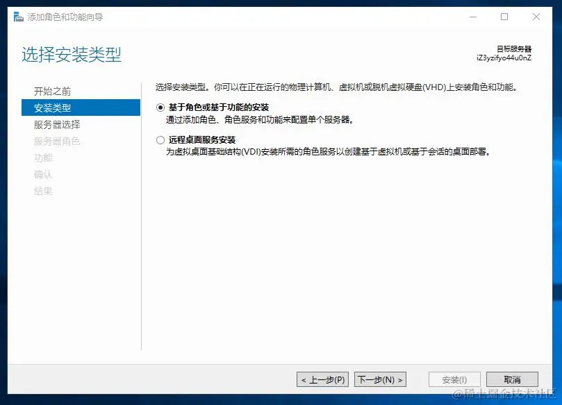 - 打开向导后,点击“下一步”,在“安装类型”中,选择“基于角色或基于功能的安装”,点击“下一步”。