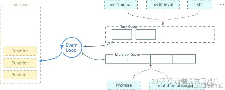- 全局script标签作为JavaScript任务执行入口起点,作为执行栈(Call Stack),执行栈中的都是同步任务,如果遇到异步任务,则先把异步任务放到任务队列(Task Queue)或微任务队列(Microtask Queue)中。