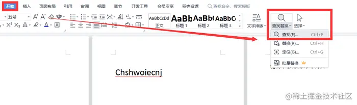 步骤一: 在“开始”栏,点击“查找替换”功能,也可以直接按“Ctrl+F”键或者“Crtl+H”键快速唤起查找替换功能。