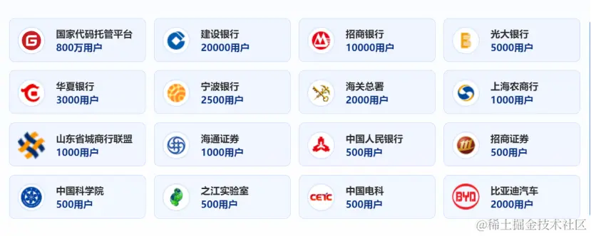 与此同时,Gitee 始终肩负国家开源代码托管平台项目的牵头方的责任,持续投身代码托管平台建设,服务了超过 800 万名开发者,助推 20 万家企业迈向高效能研发,其中不乏中国人民银行、光大银行、徽商银行、浪潮集团、上海农商行、之江实验室、一汽集团等多家知名机构与企业。