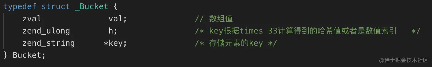 Bucket 的结构比较简单,主要用来保存元素的 key 和 value,以及一个整型的 h(散列值,或者叫哈希值):如果元素是数值索引,则其值就是数值索引的值;如果是字符串索引,那么其值就是 key 通过 Time33 算法计算得到的散列值,h 的值用来最终映射元素的存储位置。Bucket 的数据结构如下: