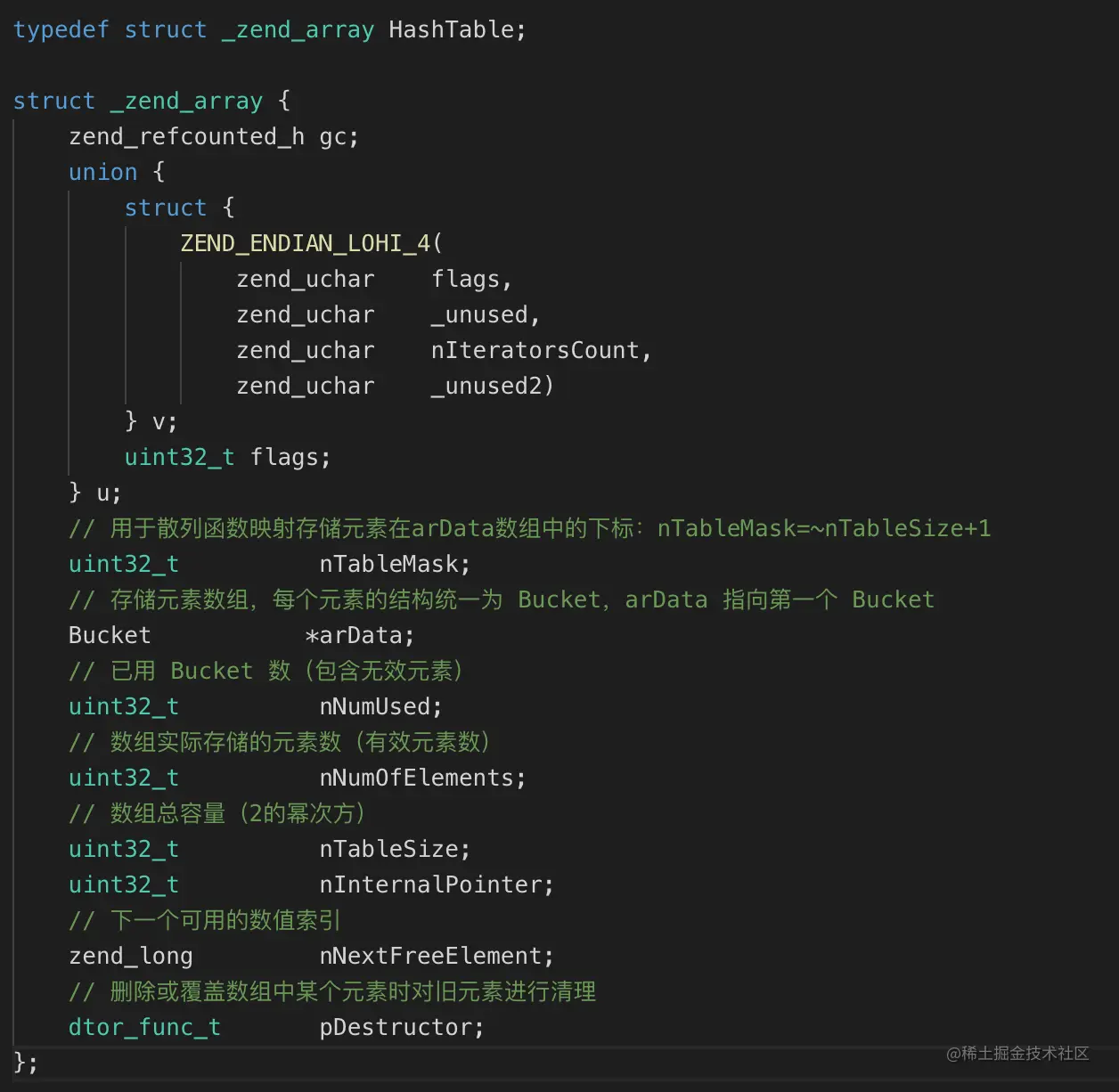 PHP数组依赖的散列表数据结构定义如下(位于Zend/zend_types.h)