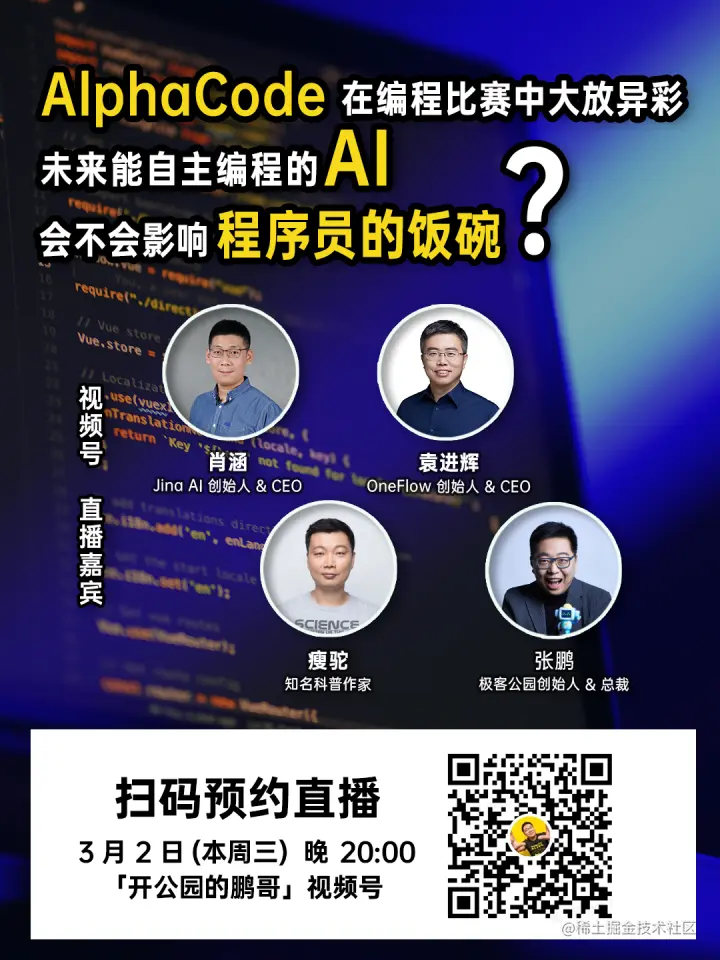 今晚 (3 月 2 日,本周三),Jina AI 创始人兼 CEO 肖涵博士,将做客「开公园的鹏哥」视频号直播间,与 OneFlow 创始人兼 CEO 袁进辉博士、知名科普作家瘦驼及极客公园创始人兼总裁张鹏,共同探讨自主编程 AI 对程序员饭碗的影响。