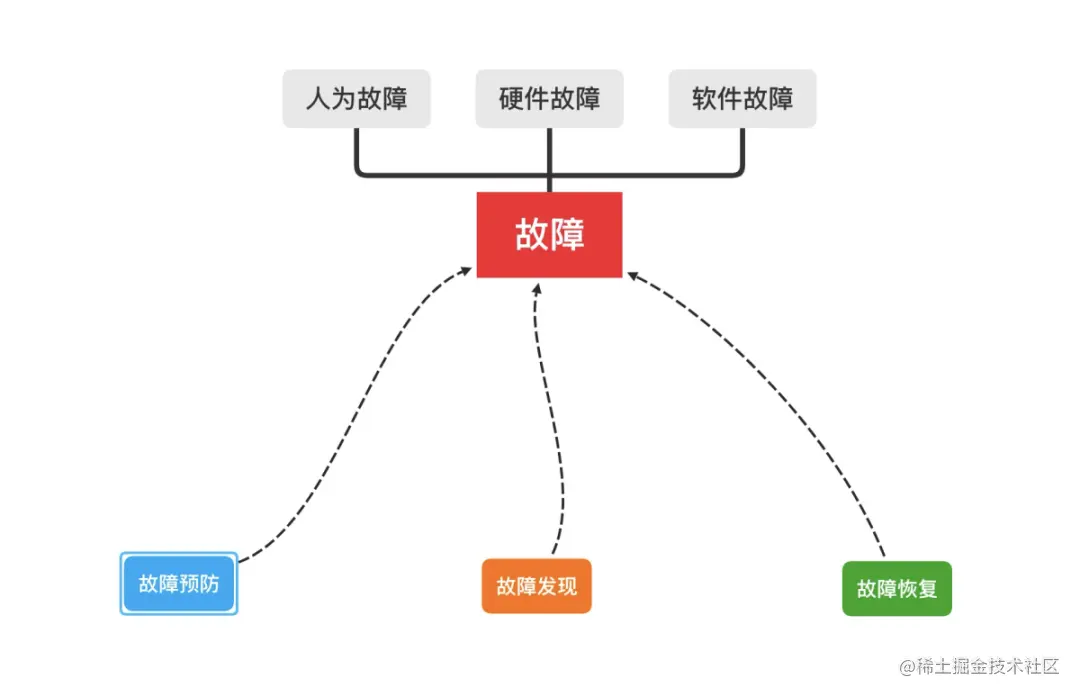 对于一个动态演进的系统而言,我们没有办法将故障发生的概率降为0,只能通过在软件生产的过程中,建立流程规范和机制来尽量减少其发生。其次对于一个运行的系统,我们需要建立并完善监控和预警机制来及时发现系统中的故障,并通过执行预案使系统快速恢复。基于上述结论,为了提高系统的可用性,需要从以下三个方面入手开展工作:故障预防,故障发现和故障恢复。