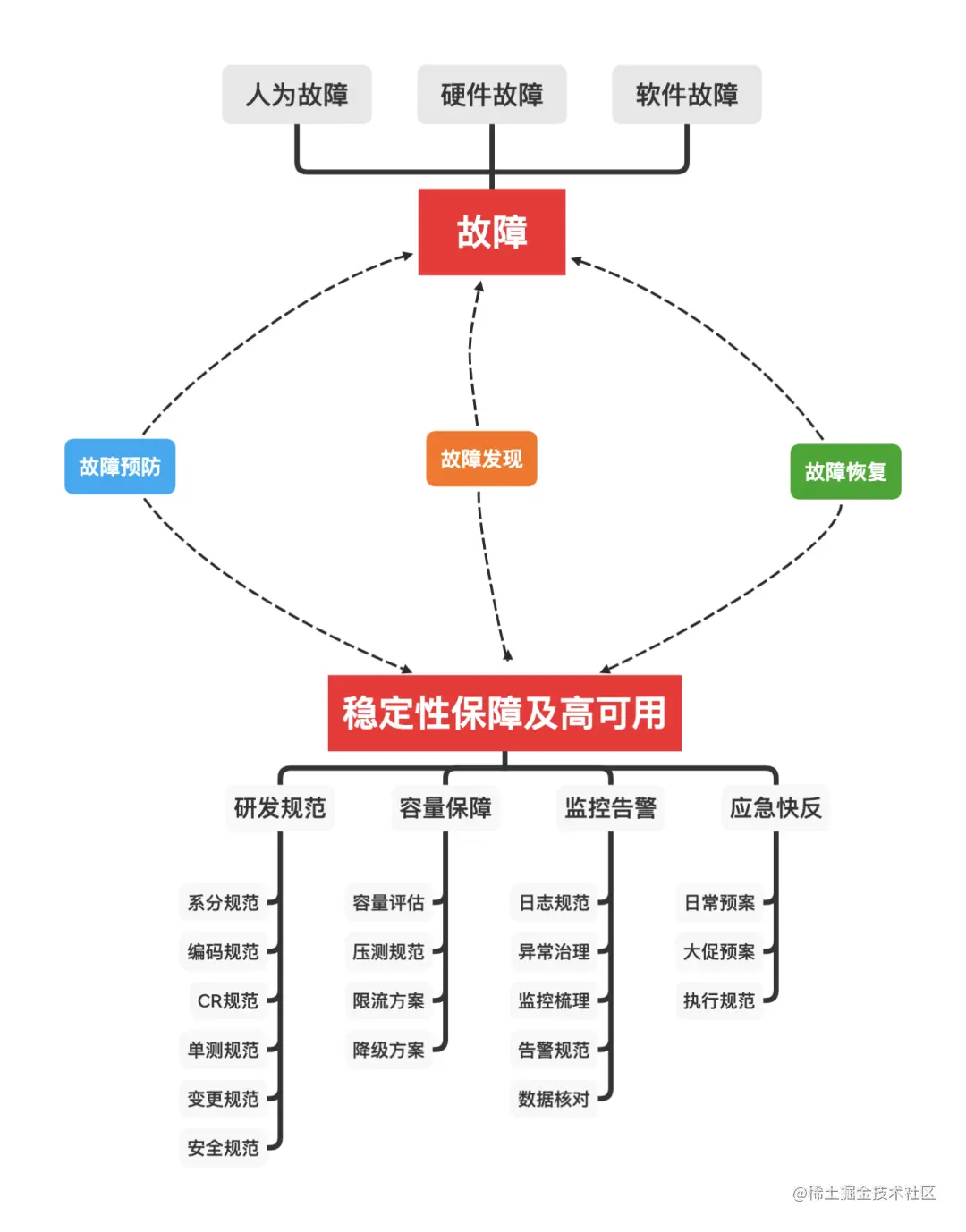 至此,本次命题的目标,KPI就清晰了。保障系统的稳定性和高可用的目标是使系统处于稳定的工作状态,对用户不产生负面的影响,避免线上问题和P级故障的发生。核心kpi是系统的可用性。为了提高系统的可用性,我们应该首先保障系统的稳定性,减少非稳定状况的发生,其次当系统由于各个组成部分发生故障,出现非稳定状态时,能够快速发现并将其恢复到稳定可用的状态。