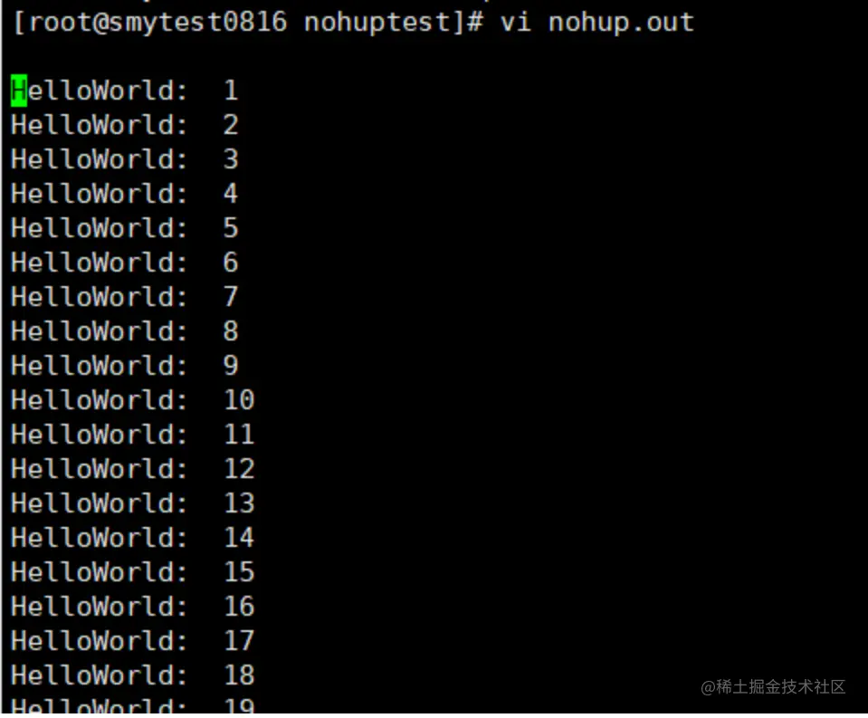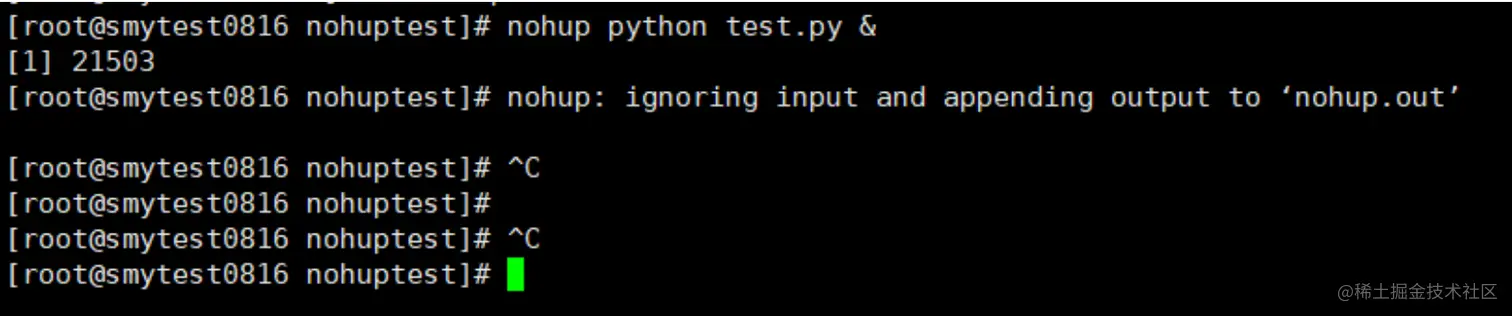 - 有一个“忽略输入,输出至nohup.out”的提示
