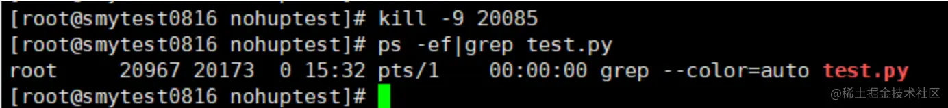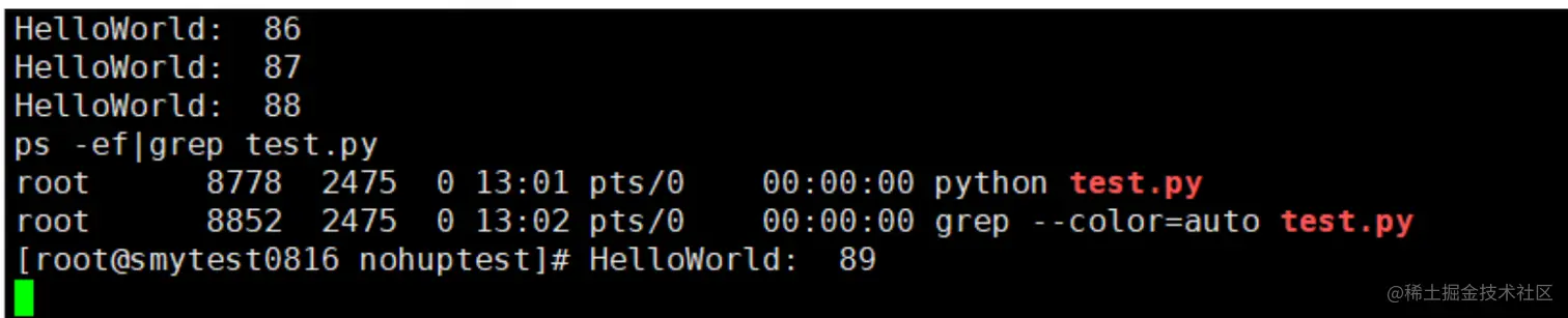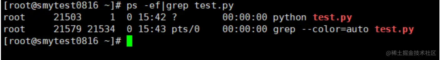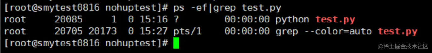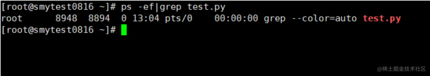 执行ps -ef|grep test.py查询一下,程序进程确实存在,如下图所示: