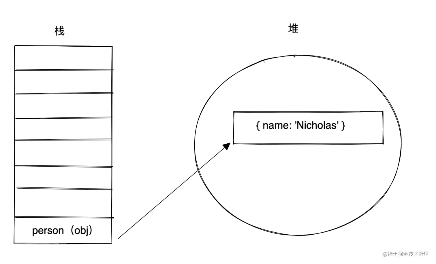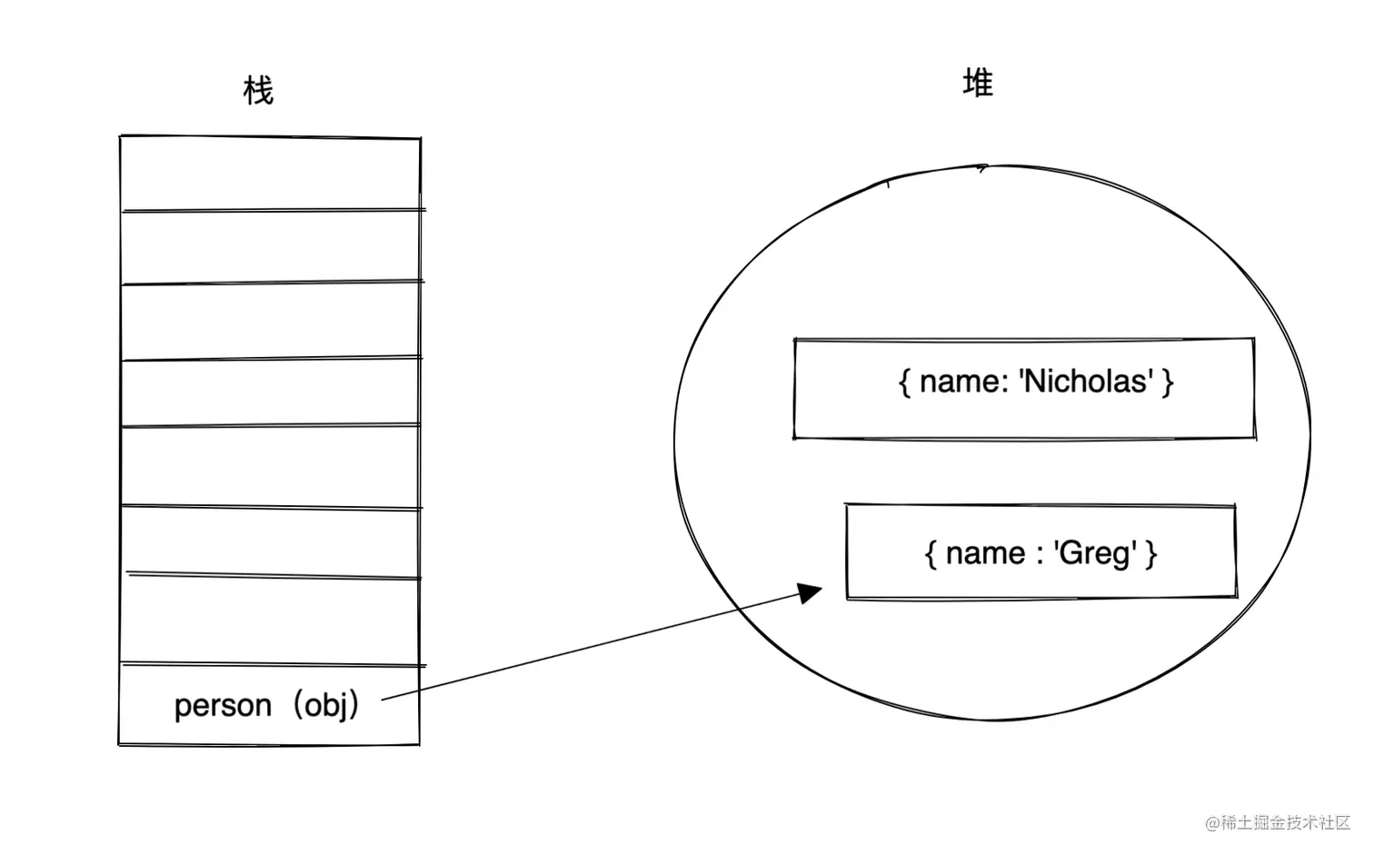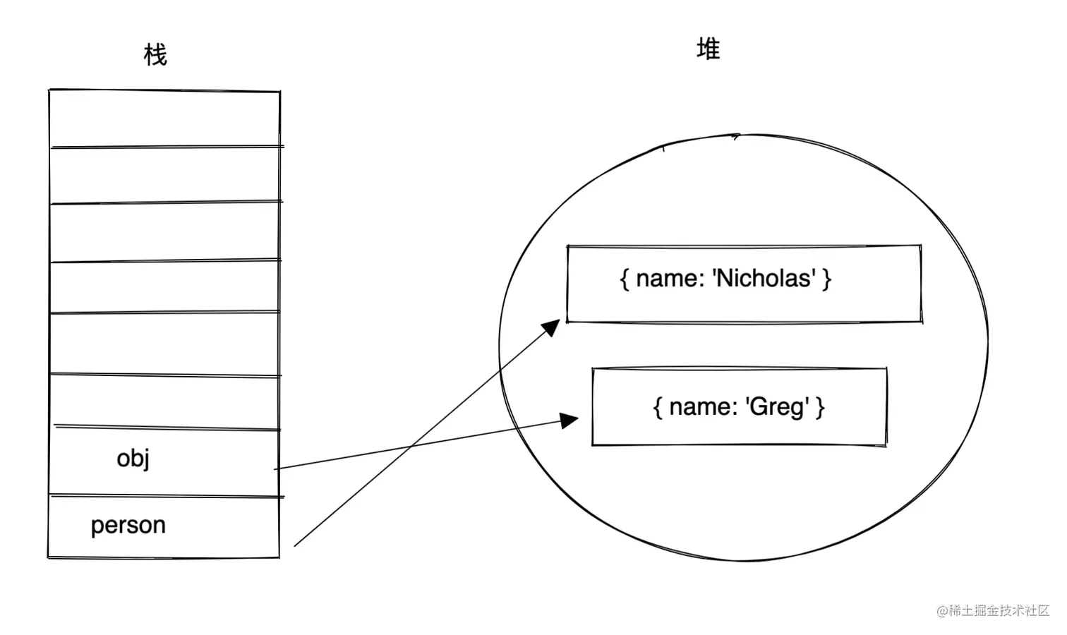 而真实的情况是 函数的参数都是按值传递的, person的堆地址被复制了一份赋值给了obj参数